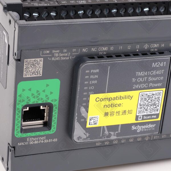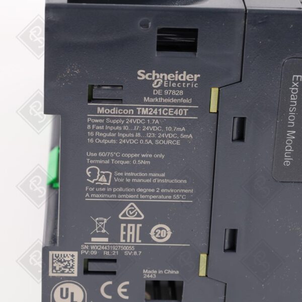 ПРОГРАММИРУЕМЫЙ ЛОГИЧЕСКИЙ КОНТРОЛЛЕР MODICON M241, 40 ВХОДОВ/ВЫХОДОВ, 24 ДИСКРЕТНЫХ ВХОДА (24 В ПОСТОЯННОГО ТОКА, 8 БЫСТРЫХ ВХОДОВ, ТИП 1 IEC), 16 ТРАНЗИСТОРНЫХ ВЫХОДА PNP (0.5 А, 4 БЫСТРЫХ ВЫХОДА 0.1 А С ЧАСТОТОЙ ДО 100 КГЦ), НАПРЯЖЕНИЕ ПИТАНИЯ 24 В ПОСТОЯННОГО ТОКА (19.2-28.8 В), ПОТРЕБЛЯЕМАЯ МОЩНОСТЬ 32.6-40.4 ВТ, ВСТРОЕННЫЕ ПОРТЫ: 2 ПОСЛЕДОВАТЕЛЬНЫХ (RS232/RS485), 1 USB, 1 ETHERNET (10/100 МБИТ/С), ПОДДЕРЖКА MODBUS RTU/TCP, ETHERNET/IP, ВСТРОЕННЫЕ ЧАСЫ РЕАЛЬНОГО ВРЕМЕНИ, ПОДДЕРЖКА SD-КАРТЫ ДО 32 ГБ, ПАМЯТЬ ПРОГРАММЫ 128000 СТРОК, ПАМЯТЬ ДАННЫХ 64 МБ, ВРЕМЯ ВЫПОЛНЕНИЯ ЦИКЛА 0.3 МС/1000 ИНСТРУКЦИЙ, ПРОГРАММИРОВАНИЕ ПО EC61131-3 (IL, ST, FBD, SFC, LD), РАБОЧАЯ ТЕМПЕРАТУРА ОТ 0 ДО +55°C, СТЕПЕНЬ ЗАЩИТЫ IP20, МОНТАЖ НА DIN-РЕЙКУ 35 ММ, РАСШИРЕНИЕ ДО 7 МОДУЛЕЙ TM3, ПОДДЕРЖКА FDR (FAST DEVICE REPLACEMENT)