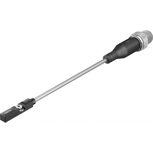 Датчик положения Festo для Т-образной канавки. Магниторезистивный, стойкий к щелочам, кислотам и СОЖ, нормально разомкнутый контакт, диапазон рабочего напряжения: 5 ÷ 30V DC, электрическое подключение: кабель с разъемом М12Х1.