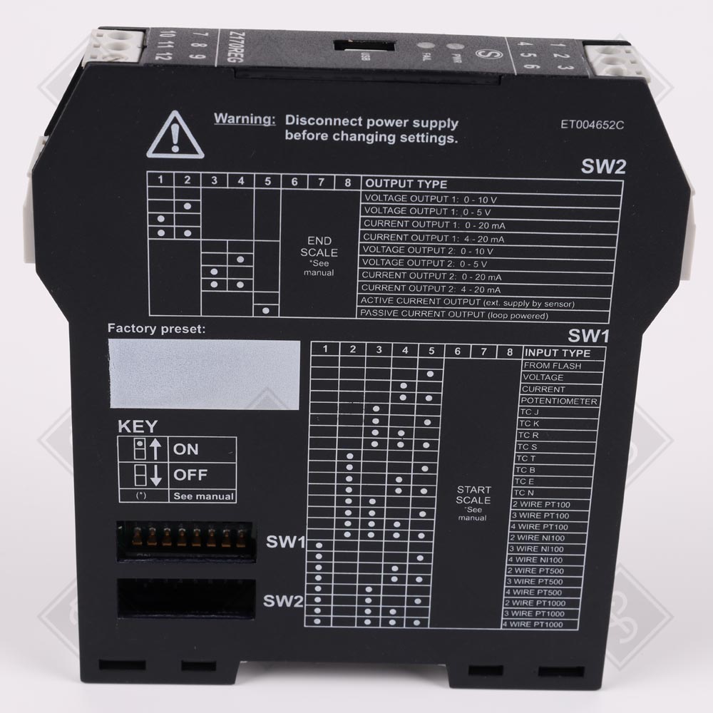 УНИВЕРСАЛЬНЫЙ ПРЕОБРАЗОВАТЕЛЬ С 2 ГАЛЬВАНИЧЕСКИ РАЗДЕЛЕННЫМИ АНАЛОГОВЫМИ ВЫХОДАМИ, ВХОДЫ: ТОК (0-20 МА, 4-20 МА), НАПРЯЖЕНИЕ (0-10 В, 0-5 В, 2-10 В, 1-5 В), ТЕРМОПАРЫ (J, K, R, S, T), RTD (PT100, PT500, PT1000, NI100), ПОТЕНЦИОМЕТР (1-100 КОМ), ПЕРИОД ЭЧАСТИЛЛОНИРОВАНИЯ 5-20 МС, РАЗРЕШЕНИЕ 14 БИТ, ИЗОЛЯЦИЯ 1500 В ПЕРЕМЕННОГО ТОКА (ВХОД/ВЫХОД/ПИТАНИЕ), НАПРЯЖЕНИЕ ПИТАНИЯ 10-40 В ПОСТОЯННОГО ТОКА / 19-28 В ПЕРЕМЕННОГО ТОКА (50/60 ГЦ), ВЫХОДЫ: ТОК (0-20 МА, 4-20 МА, АКТИВНЫЙ/ПАССИВНЫЙ), НАПРЯЖЕНИЕ (0-10 В, 2-10 В, 0-5 В, 1-5 В), СТЕПЕНЬ ЗАЩИТЫ IP20, РАБОЧАЯ ТЕМПЕРАТУРА ОТ -20 ДО +65°C, ПОДКЛЮЧЕНИЕ ЧЕРЕЗ ВИНТОВЫЕ КЛЕММЫ, НАСТРОЙКА ЧЕРЕЗ DIP-ПЕРЕКЛЮЧАТЕЛИ ИЛИ ПО (EASY SETUP, USB/ANDROID), ВЕС 154 Г