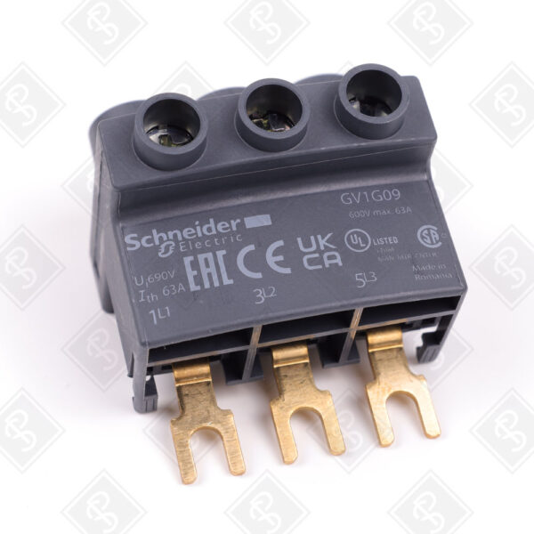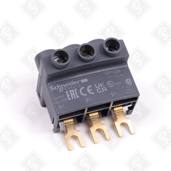 3-ПОЛЮСНЫЙ ТЕРМИНАЛЬНЫЙ БЛОК ВЕРХНЕЙ ПОДАЧИ ДЛЯ ШИН, НОМИНАЛЬНЫЙ ТОК 63 А, НОМИНАЛЬНОЕ НАПРЯЖЕНИЕ 690 В ПЕРЕМЕННОГО ТОКА, ВИНТОВЫЕ ЗАЖИМЫ, СТЕПЕНЬ ЗАЩИТЫ IP20, СОВМЕСТИМОСТЬ С АВТОМАТАМИ TESYS GV2, TESYS D И TESYS U, МОНТАЖ НА DIN-РЕЙКУ ИЛИ ПАНЕЛЬ, РАЗМЕРЫ 45X45X35 ММ, СООТВЕТСТВИЕ СТАНДАРТАМ IEC 60947-1, UL, CSA