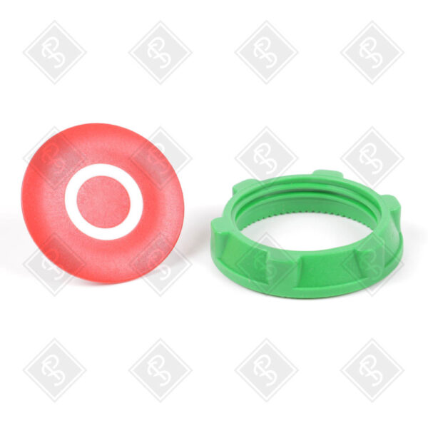 — Цвет кнопки: красный с белым обозначением «O» (flush).