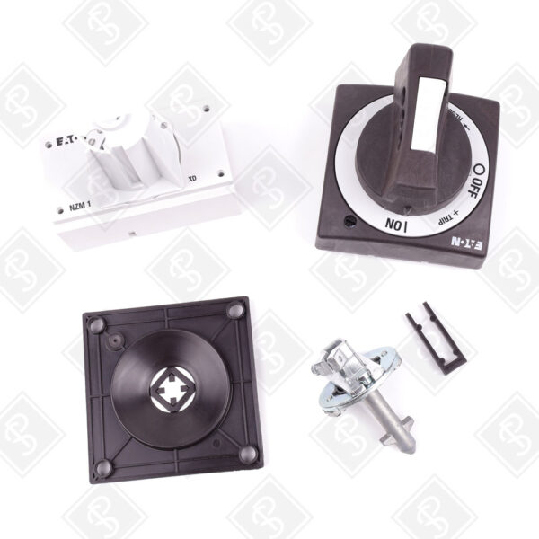 Поворотная ручка для управления выключателями через закрытую дверь шкафа управления в системах распределения электроэнергии, совместима с выключателями Eaton серий NZM1(-4), PN1(-4), N(S)1(-4), обеспечивает блокировку и защиту в промышленных условиях.