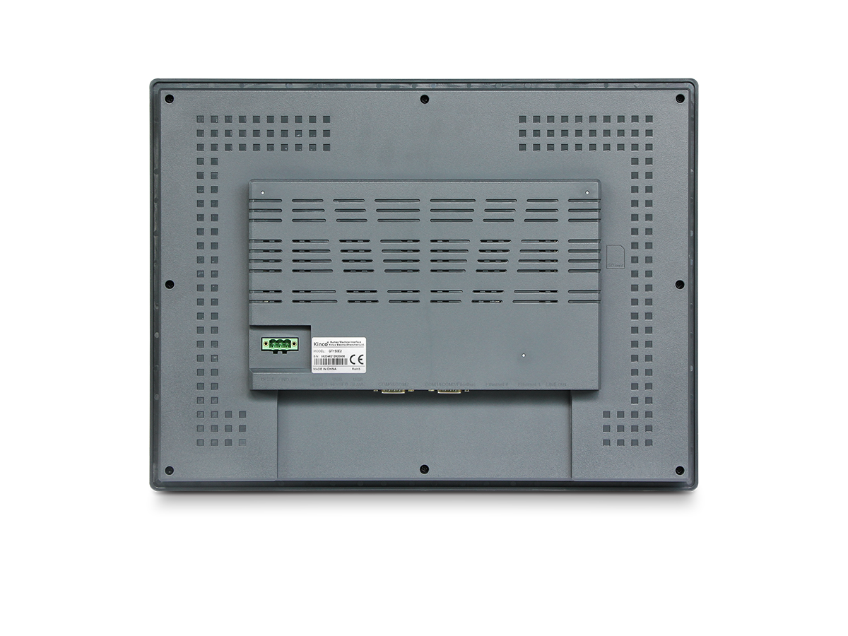 Панель оператора сенсорная, серии Green, дисплей TFT, размер 15″, разрешение 1024×768 точек, 16,77 млн. цв., яркость 420 кд/м2, встроенные интерфейсы 2xRS232, 2xRS485, 2xRS422, 1xUSB slave,1xUSB host,2xRJ45, напряжение питания 24 В DC, потребляемая мощность 16 Вт, габаритные размеры ВхШхГ 398х298х47 мм, монтажный вырез 383х283 мм, вес 3 кг, степень защиты IP65, среда разработки Kinco Dtools, максимальное кол-во экранов в проекте HMI 999.