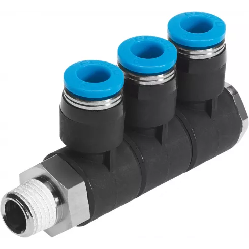 Разветвитель угловой поворотный с тремя выходами Festo QSLV3-1/4-8 — разводной многосекционный коллектор на 3 ответвления. С возможностью поворота на 360° и выравнивания. Предназначен для использования с пневматическими шлангами с наружным диаметром от 4 до 12 мм.