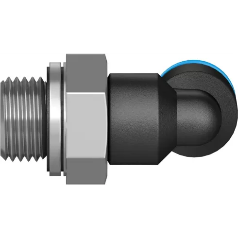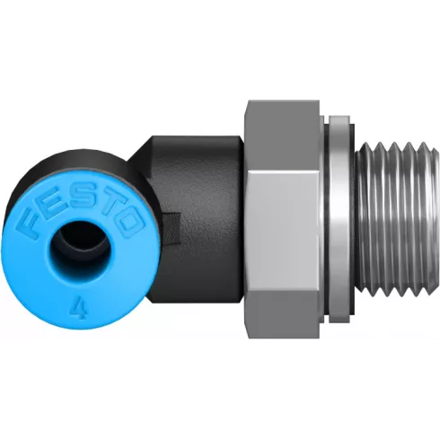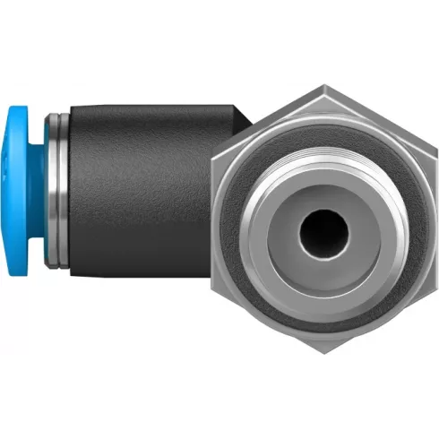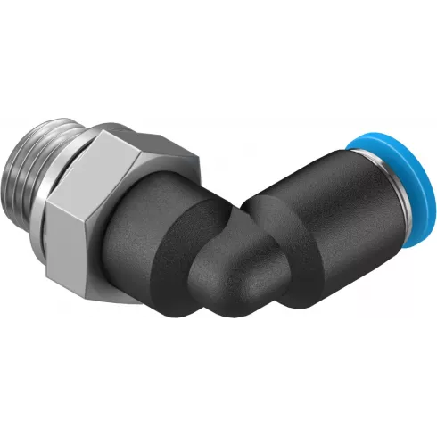 Угольник резьбовой Festo QSL-G1/8-4 — угловой поворотный штуцер с наружной резьбой и внешним шестигранником. Входит в состав стандартной серии фитингов QS, которые подходят для большого количества применений.