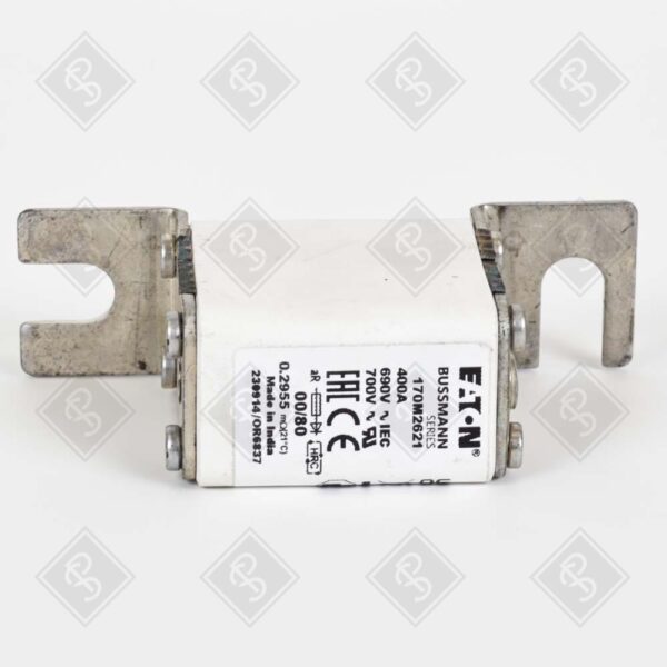 ПРЕДОХРАНИТЕЛЬ BUSSMANN 170M2621: 400А, 690В (IEC) / 700В (UL), КЛАСС aR, 200кА, ТИП 00, С ОДНОСТОРОННИМ ИНДИКАТОРОМ СОСТОЯНИЯ, ПРЯМОУГОЛЬНЫЙ КОРПУС СО СМЕЩЕННЫМИ КОНТАКТАМИ ПОД БОЛТ (РАЗРЕЗНЫМИ), ТОКОВЕДУЩИЕ ЗАЖИМНЫЕ ЯЗЫЧКИ, ЗАЩИТА ПОЛУПРОВОДНИКОВ, СОГЛАСНО DIN 43653 И IEC 60269-4