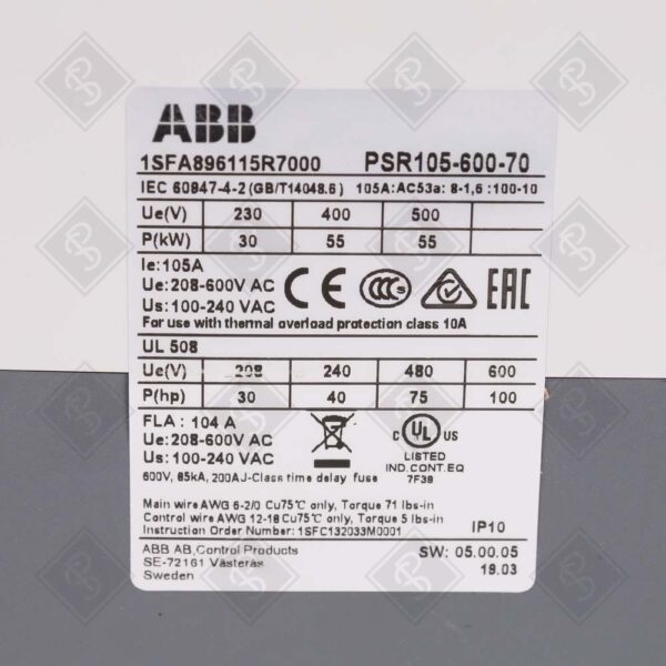 НОМИНАЛЬНОЕ РАБОЧЕЕ НАПРЯЖЕНИЕ 208–600 В ПЕРЕМЕННОГО ТОКА, НОМИНАЛЬНОЕ УПРАВЛЯЮЩЕЕ НАПРЯЖЕНИЕ 100–240 В ПЕРЕМЕННОГО ТОКА, НОМИНАЛЬНЫЙ ТОК 105 А, МОЩНОСТЬ ДВИГАТЕЛЯ 55 кВт (ПРИ 400 В), ВРЕМЯ ПУСКА 1–10 СЕКУНД, ВРЕМЯ ОСТАНОВА 0–20 СЕКУНД, ВСТРОЕННЫЙ БАЙПАС, СТЕПЕНЬ ЗАЩИТЫ IP20 (ОТКРЫТЫЙ ТИП), ЧАСТОТА 50/60 ГЦ.