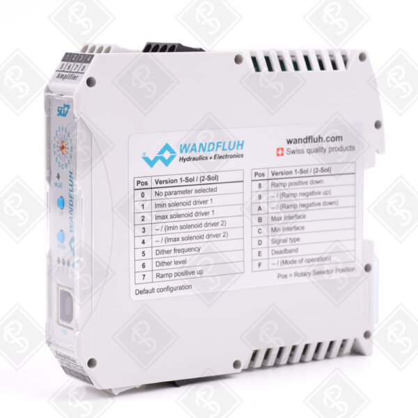 Цифровой усилитель для управления пропорциональными гидравлическими клапанами в промышленных гидравлических системах, таких как станки, прессы и мобильная техника, совместим с пропорциональными клапанами Wandfluh, поддерживает аналоговые входные сигналы и настройку параметров через программное обеспечение PASO.
