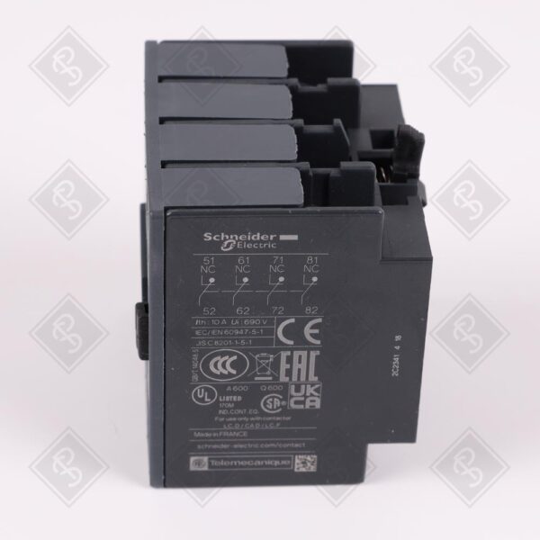 ВСПОМОГАТЕЛЬНЫЙ КОНТАКТНЫЙ БЛОК TESYS D, 4 НЗ КОНТАКТА, НОМИНАЛЬНОЕ НАПРЯЖЕНИЕ 690 В ПЕРЕМЕННОГО ТОКА, ТОК 10 А ПРИ 690 В AC И 2 А ПРИ 250 В DC, ПОДКЛЮЧЕНИЕ ПРУЖИННЫМИ КЛЕММАМИ, ФРОНТАЛЬНОЕ КРЕПЛЕНИЕ С ФИКСАЦИЕЙ, СТЕПЕНЬ ЗАЩИТЫ IP20, РАБОЧАЯ ТЕМПЕРАТУРА -5…60°C, ЧАСТОТА 25-400 ГЦ, ЭЛЕКТРИЧЕСКАЯ ИЗНОСОСТОЙКОСТЬ 1 МЛН ЦИКЛОВ, РАЗМЕРЫ 45 Х 58 Х 35 ММ, МАССА 0.06 КГ