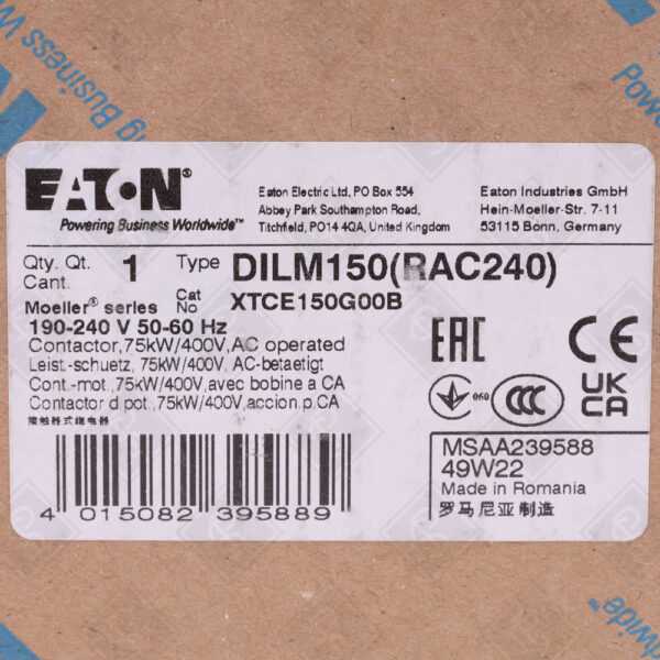 НОМИНАЛЬНЫЙ ТОК: 150 А (AC-3, 400 В); МОЩНОСТЬ: 75 КВТ (400 В, AC-3); НАПРЯЖЕНИЕ УПРАВЛЕНИЯ: 240 В AC; КОЛИЧЕСТВО ПОЛЮСОВ: 3; ОТКЛЮЧАЮЩАЯ СПОСОБНОСТЬ: 10 КА; СТЕПЕНЬ ЗАЩИТЫ: IP20; РАБОЧАЯ ТЕМПЕРАТУРА: -25…+60 °C; ГАБАРИТЫ: 140 ММ X 90 ММ X 170 ММ; МОНТАЖ: DIN-РЕЙКА ИЛИ ВИНТОВОЙ; ТИП ПОДКЛЮЧЕНИЯ: ВИНТОВЫЕ КЛЕММЫ; СЕРТИФИКАЦИЯ: CE, UL, CSA