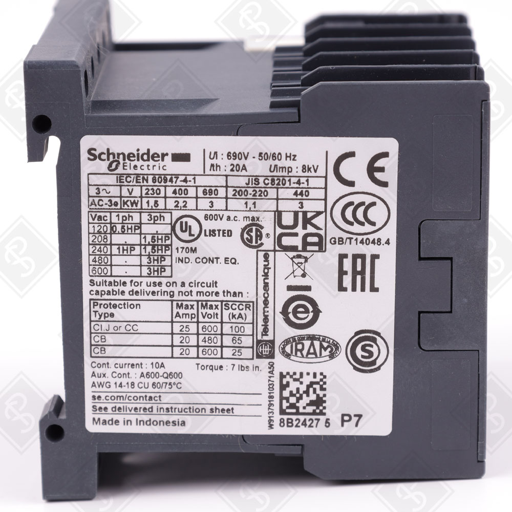 НОМИНАЛЬНЫЙ ТОК: 6 А (AC-3); МАКСИМАЛЬНАЯ НАГРУЗКА: 20 А (AC-1); НАПРЯЖЕНИЕ УПРАВЛЕНИЯ: 230 В AC, 50/60 ГЦ; НАПРЯЖЕНИЕ ПИТАНИЯ: 690 В AC; МОЩНОСТЬ: 2,2 КВТ ПРИ 400 В (AC-3); КОЛИЧЕСТВО ПОЛЮСОВ: 3; КОНФИГУРАЦИЯ КОНТАКТОВ: 3NO (НОРМАЛЬНО ОТКРЫТЫЕ); ВСПОМОГАТЕЛЬНЫЕ КОНТАКТЫ: 1NO; СТЕПЕНЬ ЗАЩИТЫ: IP20; РАБОЧАЯ ТЕМПЕРАТУРА: -25…+50 °C; ГАБАРИТЫ: 58 ММ X 45 ММ X 57 ММ; МОНТАЖ: DIN-РЕЙКА ИЛИ ПАНЕЛЬ; СЕРТИФИКАЦИЯ: CE, UL, CSA