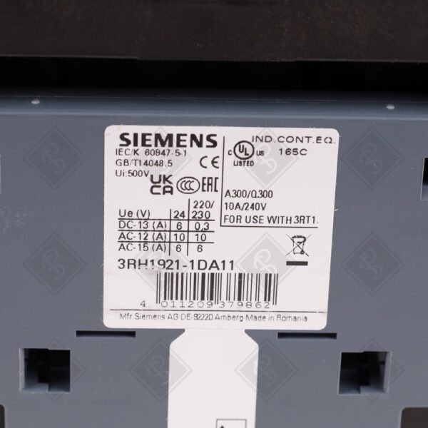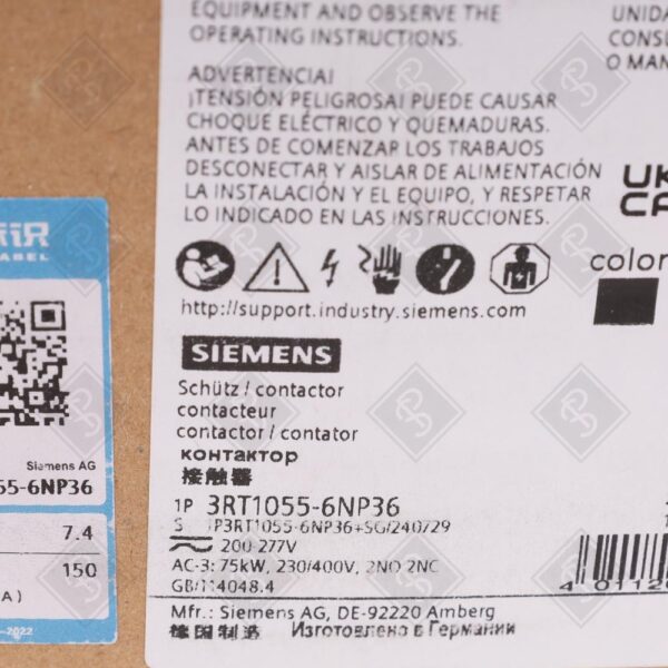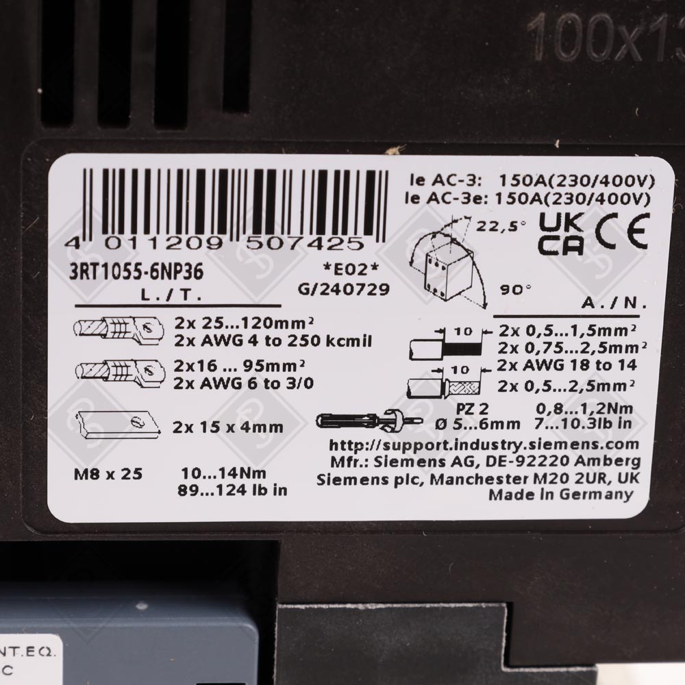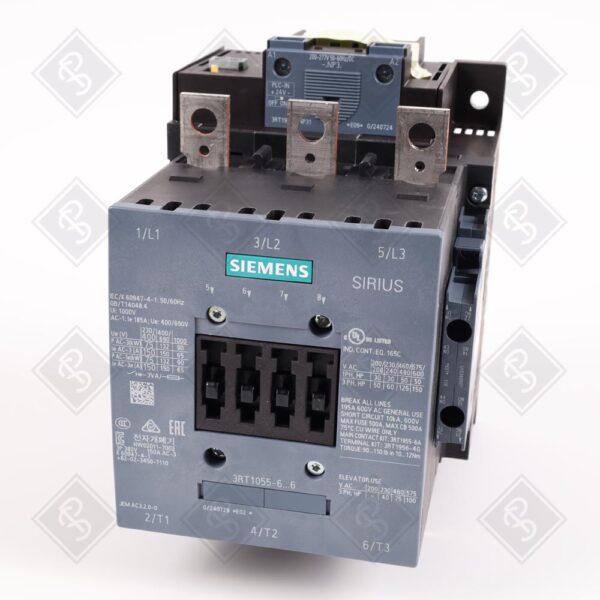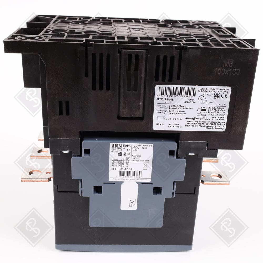 Используется для коммутации электродвигателей в системах промышленной автоматизации, включая производственные линии, насосные станции и вентиляционные системы. Совместим с модулями автоматизации Siemens SIRIUS, такими как реле перегрузки 3RB2056 (до 150 А), а также с дополнительными блоками вспомогательных контактов (например, 3RH1921) для расширения сигнальных цепей.