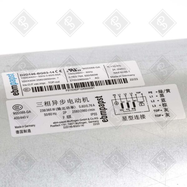 ТИП: ЦЕНТРОБЕЖНЫЙ ВЕНТИЛЯТОР С ПЕРЕДНИМ НАКЛОНОМ; МОТОР: M2D068-GA; ФАЗА: 3~; НОМИНАЛЬНОЕ НАПРЯЖЕНИЕ: 400 В / 440 В / 480 В; ЧАСТОТА: 50 ГЦ / 60 ГЦ; СКОРОСТЬ: 2580 ОБ/МИН (50 ГЦ) / 2700 ОБ/МИН (60 ГЦ); ПОТРЕБЛЕНИЕ МОЩНОСТИ: 350 ВТ (50 ГЦ) / 500 ВТ (60 ГЦ); ТОК: 0,6 А (50 ГЦ) / 0,78 А (60 ГЦ); МАКСИМАЛЬНАЯ ТЕМПЕРАТУРА ОКРУЖАЮЩЕЙ СРЕДЫ: 60°C; СТЕПЕНЬ ЗАЩИТЫ: IP44