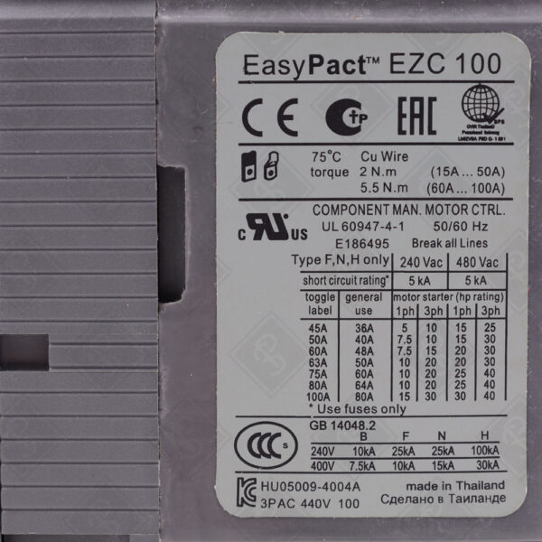 Автоматический выключатель для защиты низковольтных электрических установок в промышленности и зданиях, используется для стандартных приложений, совместим с аксессуарами EasyPact EZC100, поддерживает международные стандарты (IEC 60947, UL 508) и морские сертификации.