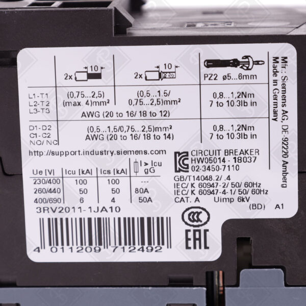 Автоматический выключатель для защиты двигателя Siemens 3RV2011-1JA10