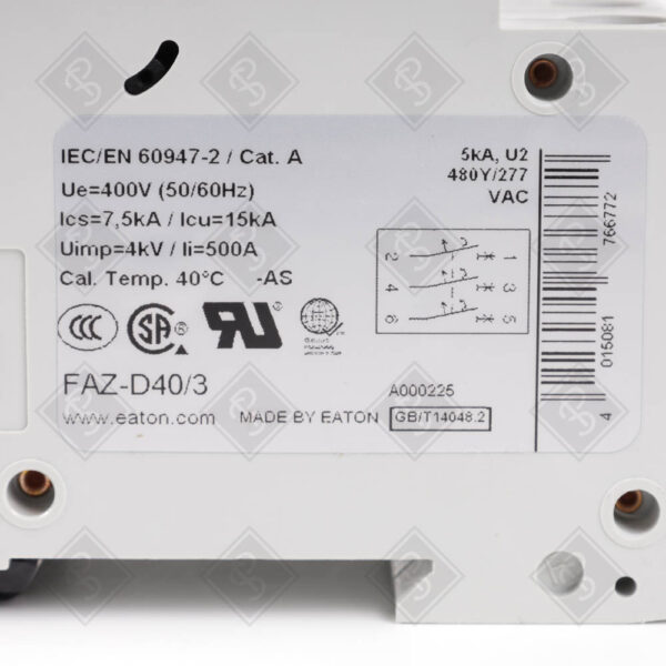 НОМИНАЛЬНЫЙ ТОК 40 А, 3 ПОЛЮСА, ХАРАКТЕРИСТИКА ОТКЛЮЧЕНИЯ D, НАПРЯЖЕНИЕ 230/400 В ПЕРЕМЕННОГО ТОКА, ОТКЛЮЧАЮЩАЯ СПОСОБНОСТЬ 10 КА, СТАНДАРТ IEC/EN 60947-2.