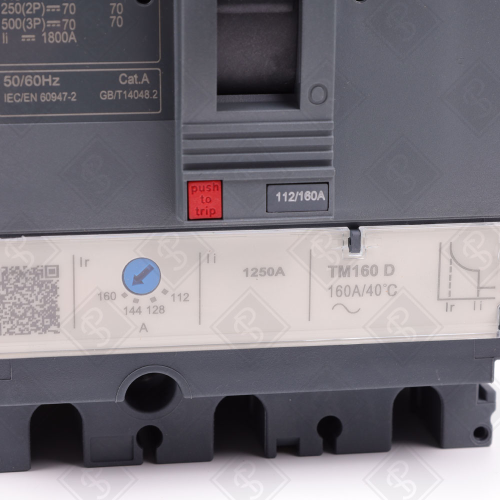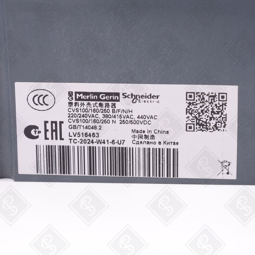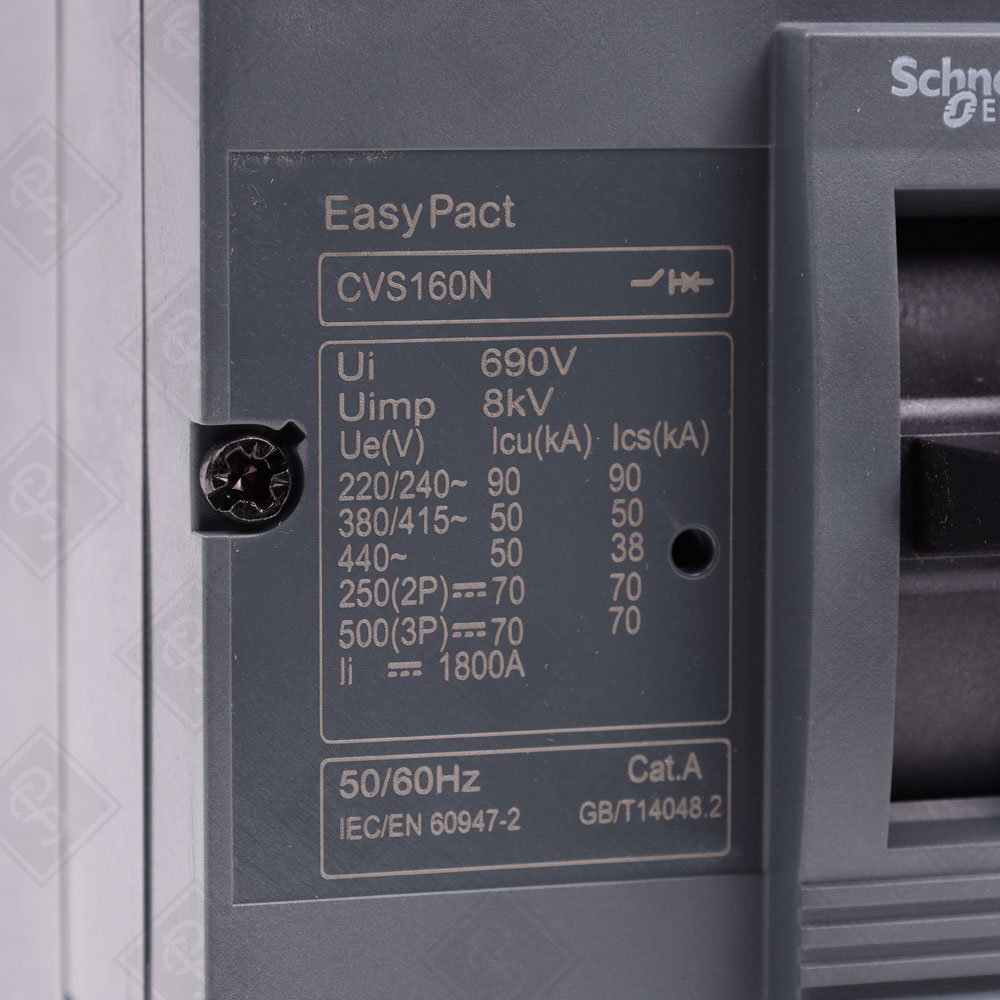 АВТОМАТИЧЕСКИЙ ВЫКЛЮЧАТЕЛЬ EASYPACT CVS160N, НОМИНАЛЬНЫЙ ТОК 160 А, ОТКЛЮЧАЮЩАЯ СПОСОБНОСТЬ 50 КА ПРИ 415 В ПЕРЕМЕННОГО ТОКА, 3 ПОЛЮСА (3P3D), ТЕРМОМАГНИТНЫЙ РАСЦЕПИТЕЛЬ TM-D С РЕГУЛИРУЕМЫМИ НАСТРОЙКАМИ, НОМИНАЛЬНОЕ НАПРЯЖЕНИЕ ≤ 690 В, СТЕПЕНЬ ЗАЩИТЫ IP40, МОНТАЖ НА DIN-РЕЙКУ ИЛИ ПЛАТУ, РАЗМЕРЫ 140 X 255 X 110 ММ, СООТВЕТСТВИЕ СТАНДАРТАМ IEC 60947-2, CE, CCC, ROHS