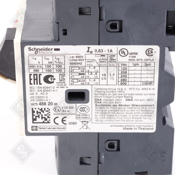 АВТОМАТИЧЕСКИЙ ВЫКЛЮЧАТЕЛЬ ДЛЯ ЗАЩИТЫ ДВИГАТЕЛЯ СЕРИИ TESYS GV2, ТЕРМОМАГНИТНЫЙ, 3-ПОЛЮСНЫЙ, ДИАПАЗОН НАСТРОЙКИ ТЕПЛОВОГО РАСЦЕПИТЕЛЯ 0.63…1 А, НОМИНАЛЬНОЕ НАПРЯЖЕНИЕ 690 В ПЕРЕМЕННОГО ТОКА, ОТКЛЮЧАЮЩАЯ СПОСОБНОСТЬ 100 КА (ПРИ 400 В), УПРАВЛЕНИЕ КНОПКАМИ, КРЕПЛЕНИЕ НА DIN-РЕЙКУ, СТЕПЕНЬ ЗАЩИТЫ IP20, РАБОЧАЯ ТЕМПЕРАТУРА -20…+60 °C, ПОДКЛЮЧЕНИЕ ЧЕРЕЗ ВИНТОВЫЕ ЗАЖИМЫ, РАЗМЕРЫ 45 ММ (Ш) X 89 ММ (В) X 78.5 ММ (Г), ВЕС ОКОЛО 0.26 КГ.