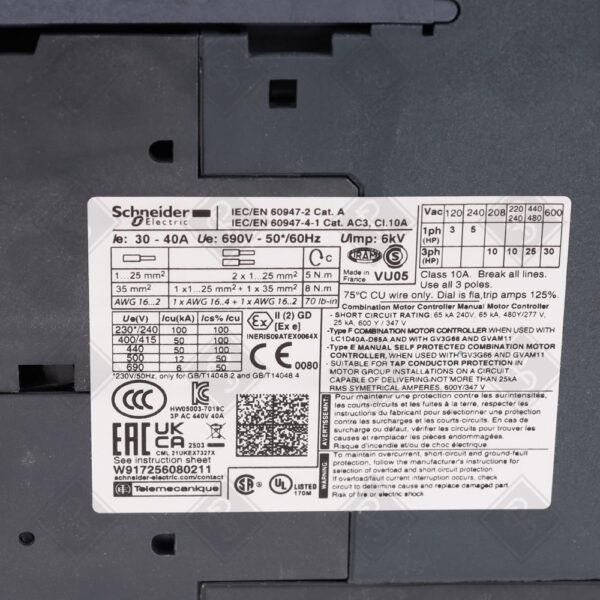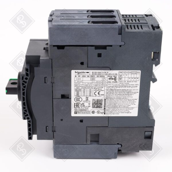 АВТОМАТИЧЕСКИЙ ВЫКЛЮЧАТЕЛЬ ЗАЩИТЫ ДВИГАТЕЛЯ TESYS GV3, 3 ПОЛЮСА, ТОК 30-40 А, ТЕПЛОВАЯ И МАГНИТНАЯ ЗАЩИТА, УСТАВКА ТЕПЛОВОЙ ЗАЩИТЫ 30-40 А, МАГНИТНОЕ ОТКЛЮЧЕНИЕ ПРИ 14XIN, МОЩНОСТЬ ДВИГАТЕЛЯ 18.5 КВТ ПРИ 400 В И 22 КВТ ПРИ 500 В ПЕРЕМЕННОГО ТОКА (50/60 ГЦ), ОТКЛЮЧАЮЩАЯ СПОСОБНОСТЬ 50 КА ПРИ 400 В, СОЕДИНЕНИЕ ЧЕРЕЗ EVERLINK BTR КЛЕММЫ, РУЧНОЕ УПРАВЛЕНИЕ С ПОВОРОТНОЙ РУЧКОЙ, СТЕПЕНЬ ЗАЩИТЫ IP20, РАБОЧАЯ ТЕМПЕРАТУРА -20…60°C, РАЗМЕРЫ 55 Х 132 Х 136 ММ, МАССА 0.96 КГ